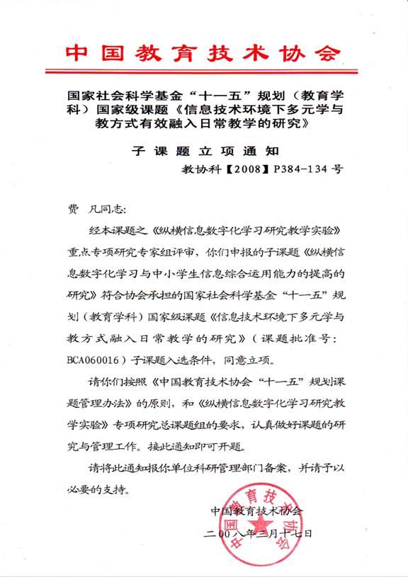 2008年3月,我校课题《纵横信息数字化学习与中小学生信息综合运用能力的提高》正式立项,其后开展了一些课题的研究,取得了一定的成绩。自2008年10月,我校课题组组长及成员进行了重新调整以后,在课题组组长周广玉老师的带领下,课题研究得到了较快的发展。