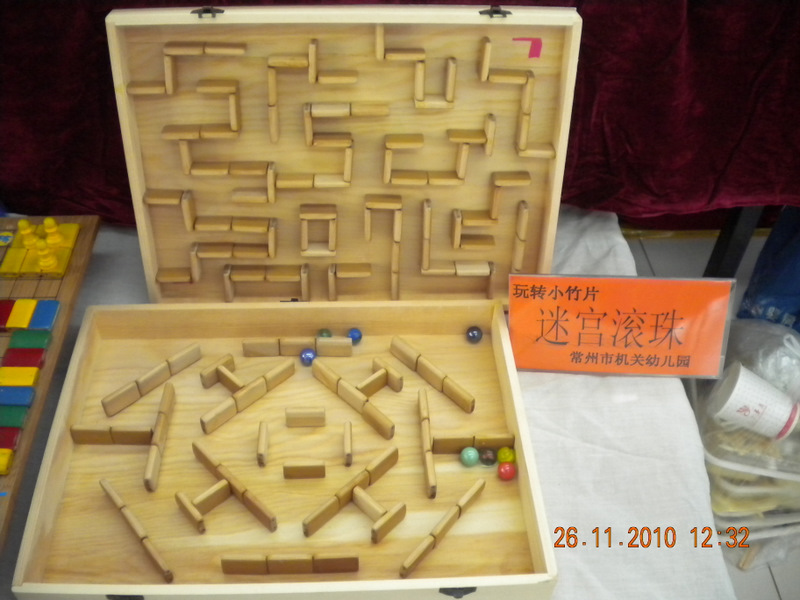 《玩转小竹片》使用的材料是废旧的麻将席拆下的小竹片,利用竹片光滑不毛刺、安全无毒、低碳环保的质材及形状的特状的特征,创造性地运用穿、拼、贴等方法,设计制作了一系列玩教具。该套作品集益智、游戏、娱乐为一体,可以对不同年龄段的幼儿不同的玩法和规划,适合各年龄班的幼儿进行操作和游戏活动,这一系列玩教具包括以下几类: